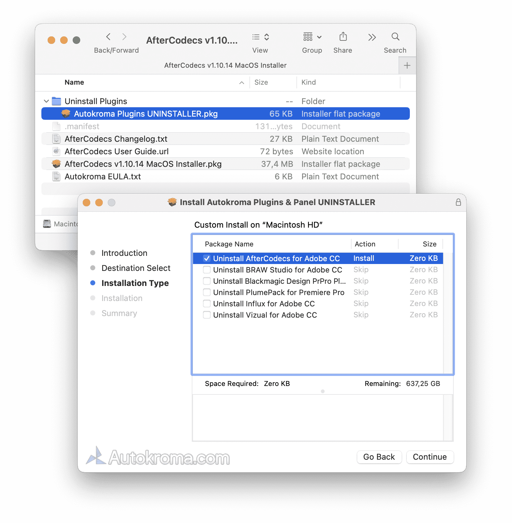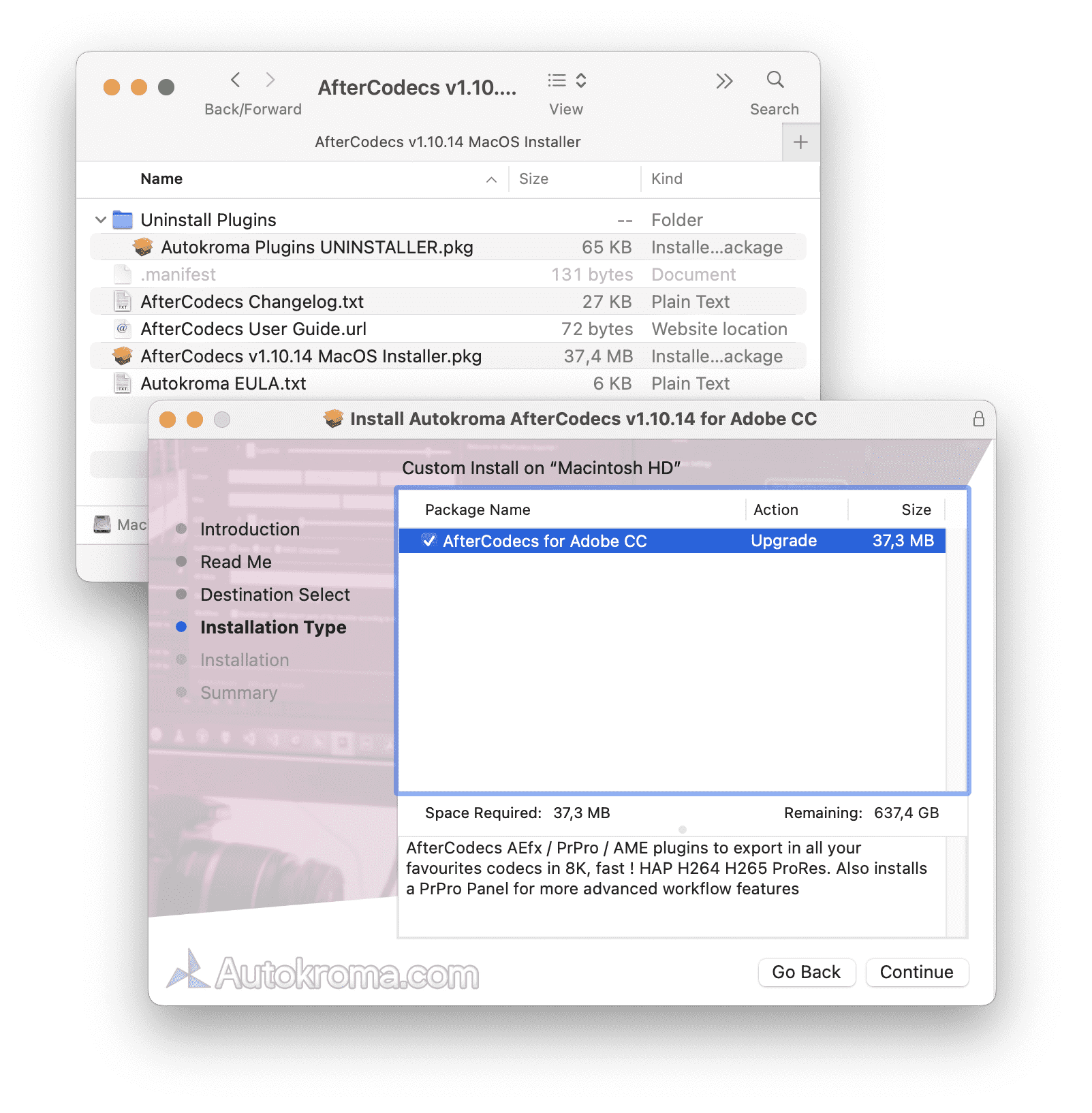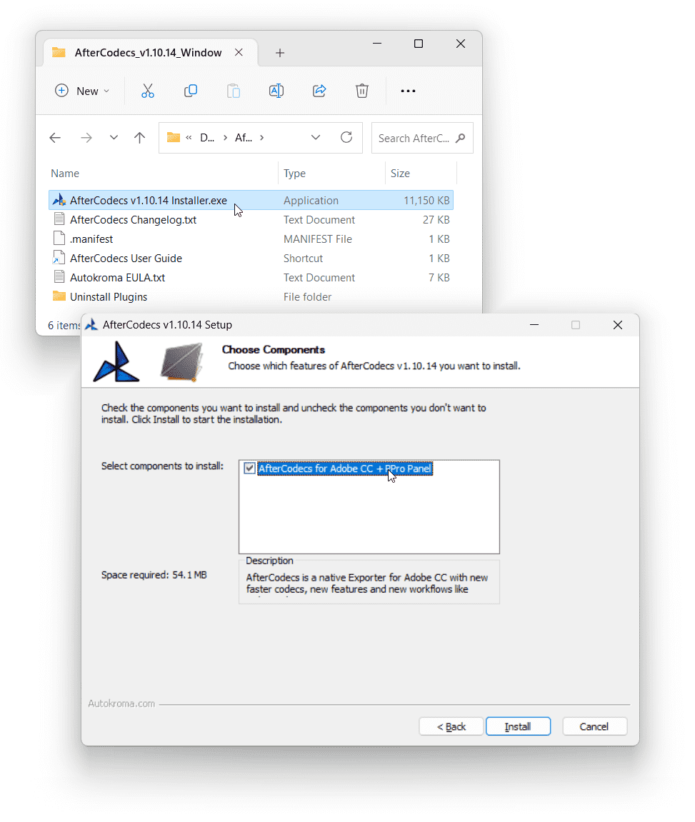 - AfterCodecs Installer is now packaged as a .DMG file with a nice interface, simply double click on the downloaded .DMG file and run the .pkg installer that shows up. The installer now also creates an Autokroma folder inside /Applications/ with an AfterCodecs Uninstaller and a link to AfterCodecs Settings and License popup so you can more easily access them like any other macOS Application