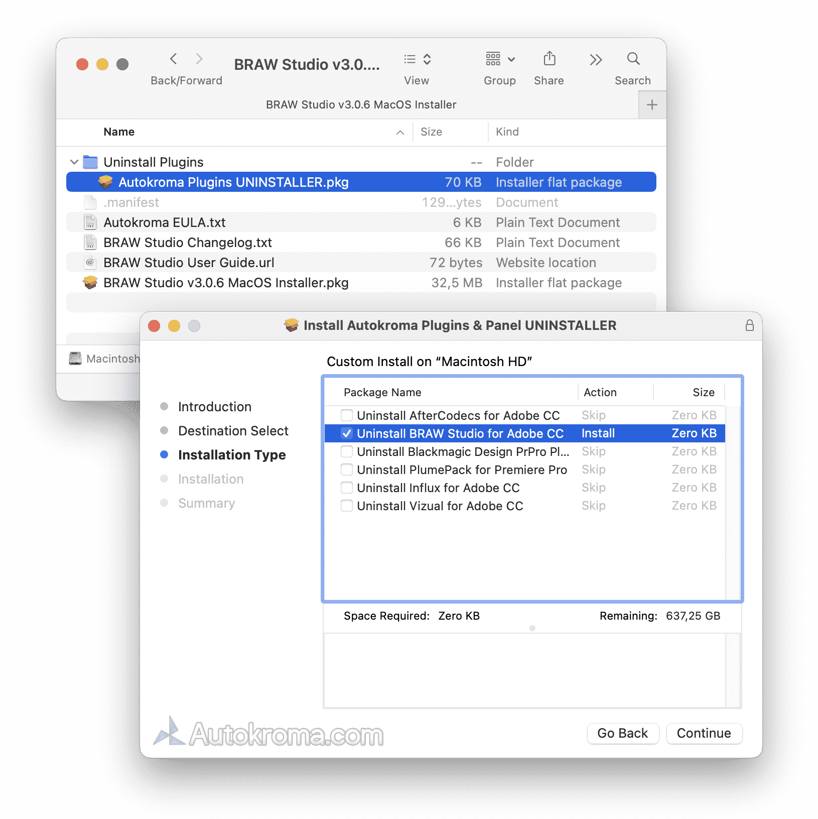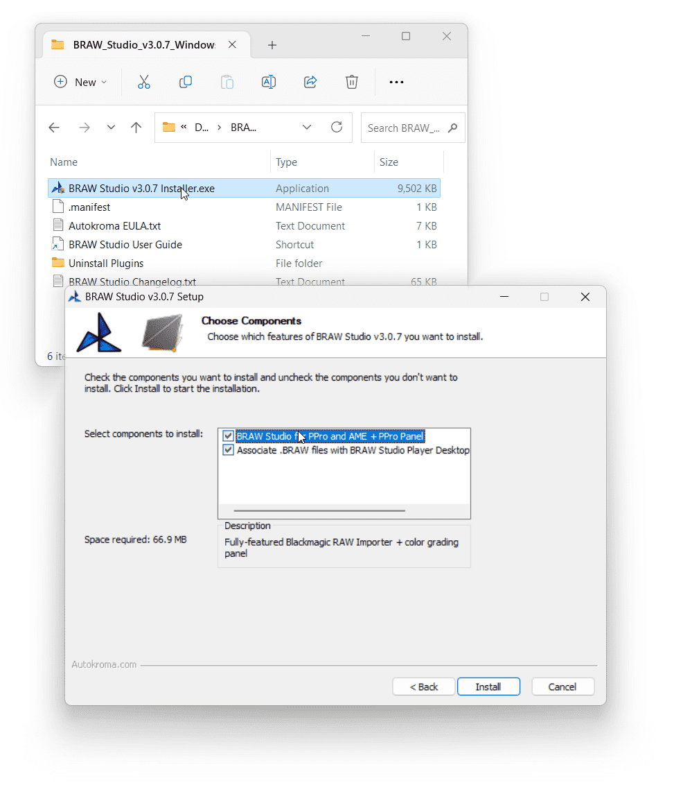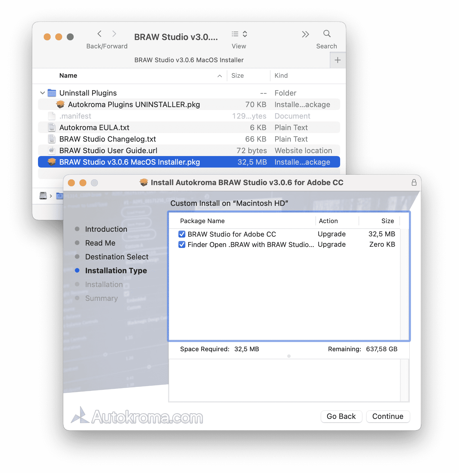 - macOS : BRAW Studio Installer is now packaged as a .DMG file with a nice interface, simply double click on the downloaded .DMG file and run the .pkg installer that shows up. The installer now also creates an Autokroma folder inside /Applications/ with a BRAW Studio Uninstaller and a link to BRAW Studio Settings and License popup so you can more easily access them like any other macOS Application
