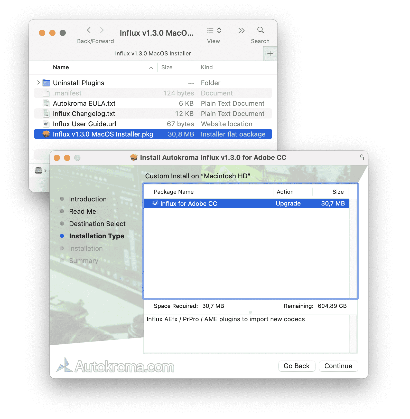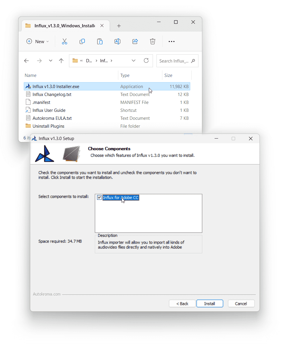 - macOS : Influx Installer is now packaged as a .DMG file with a nice interface, simply double click on the downloaded .DMG file and run the .pkg installer that shows up. The installer now also creates an Autokroma folder inside /Applications/ with an Influx Uninstaller and a link to Influx Settings and License popup so you can more easily access them like any other macOS Application